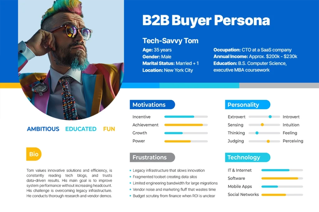 - Tech-Savvy Tom (Example Persona): Tom is a 35-year-old CTO at a mid-sized SaaS company in New York. He values innovative solutions and efficiency, is constantly reading tech blogs, and trusts data-driven results. His main goal is to improve system performance without increasing headcount; his challenge is overcoming legacy tech infrastructure. Tom conducts thorough research and seeks vendor demos with technical depth. An example persona infographic for someone like Tom is shown below. This chart illustrates how demographics (age, income), habits (reading tech literature), and goals (improving efficiency) come together in a visual format.